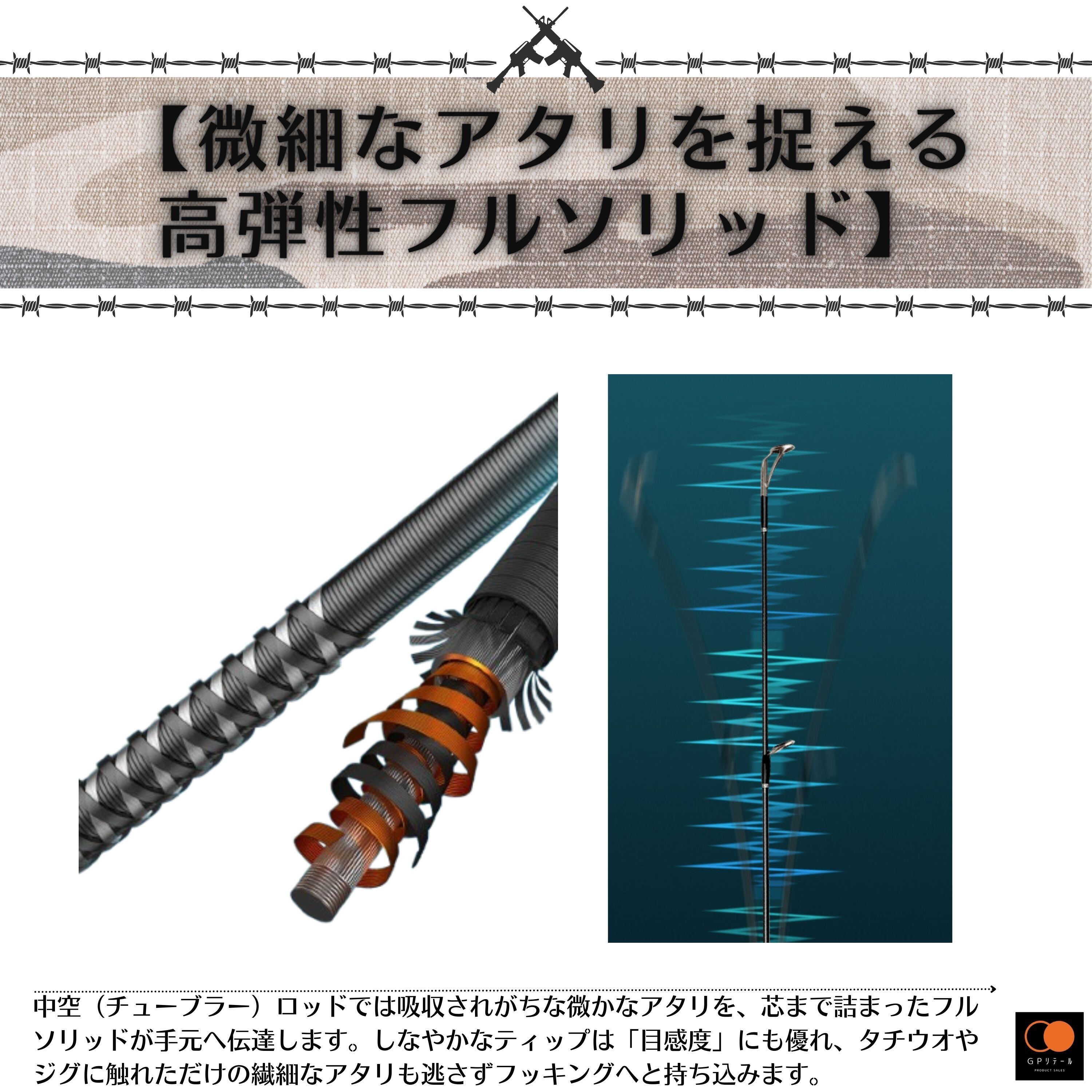 ✅【微細なアタリを捉える高弾性フルソリッド】中空(チューブラー)ロッドでは吸収されがちな微かな魚信を、芯まで詰まったフルソリッド構造がダイレクトに手元へ伝達します。しなやかなティップは「目感度」にも優れ、タチウオやサワラがジグに触れただけの繊細なアタリも逃さずフッキングへと持ち込みます。