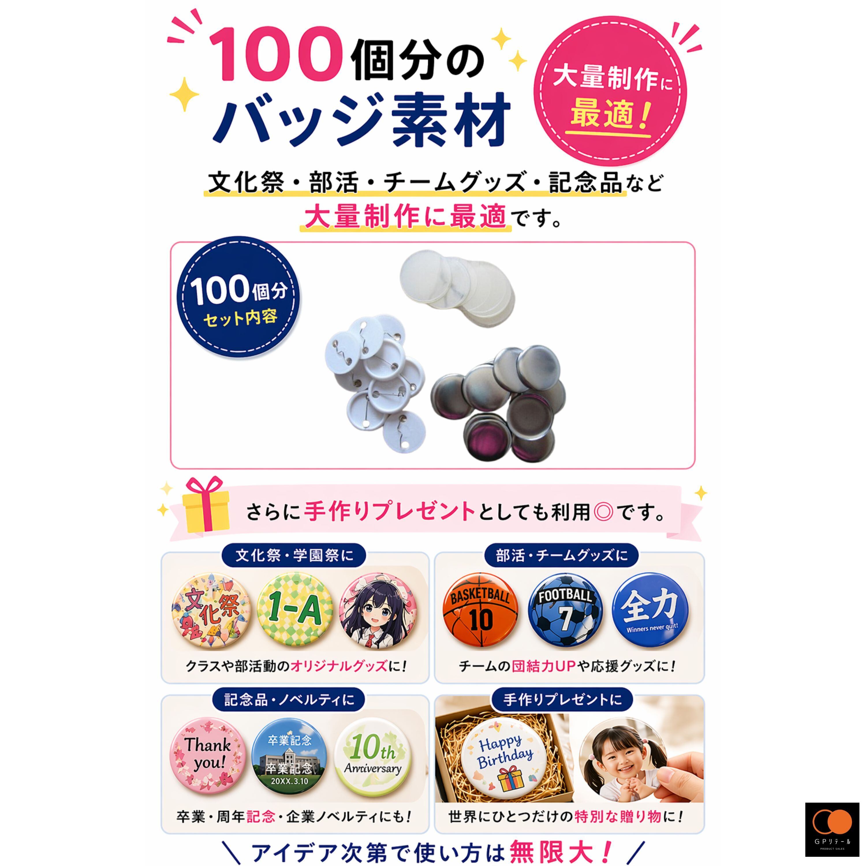 ✅【イベント・学校・プレゼントでも活躍】100個分のバッジ素材は、文化祭・部活・チームグッズ・記念品など大量制作に最適です。さらに手作りプレゼントとしても利用◎です。