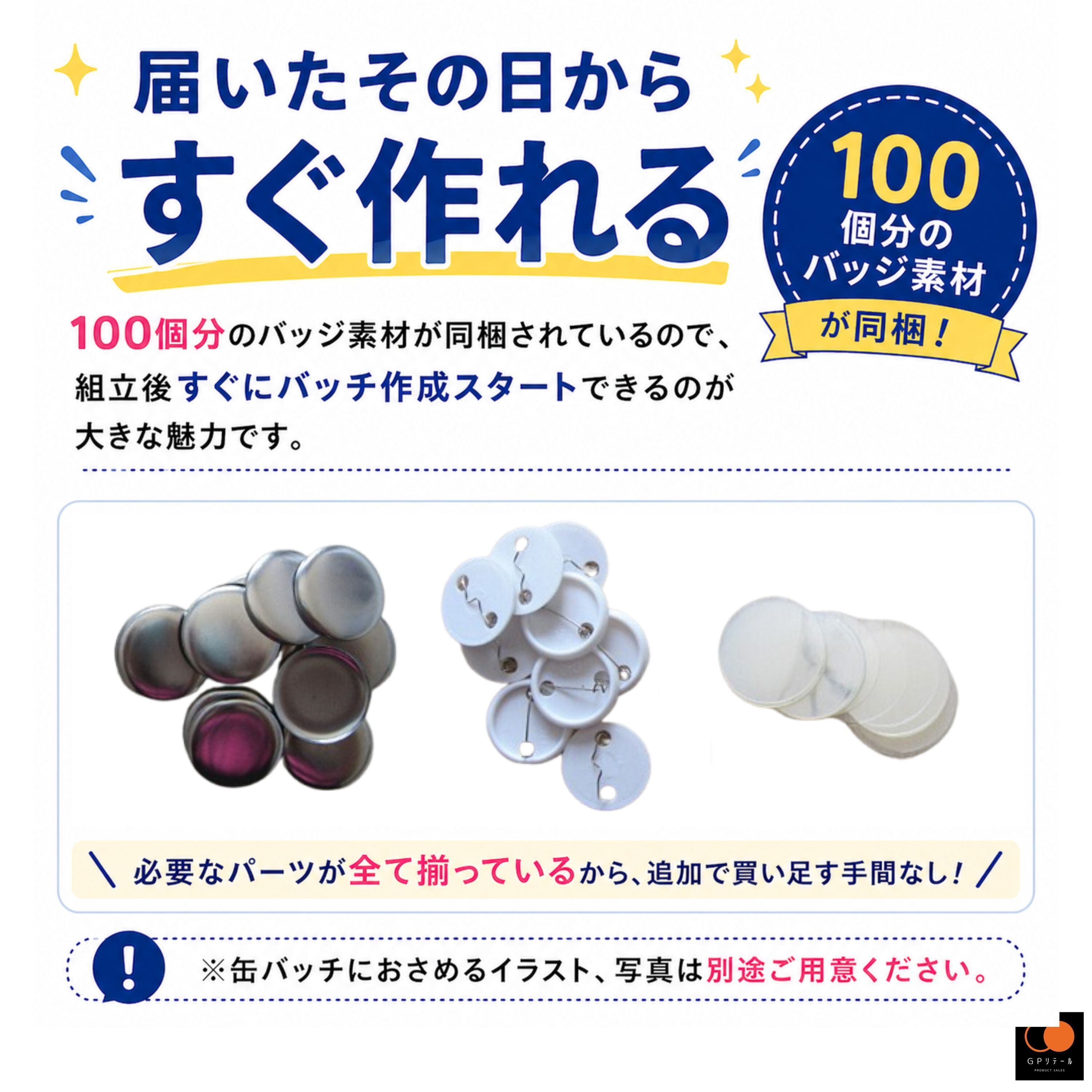 ✅【届いたその日からすぐ作れる】100個分のバッジ素材が同梱されているので、組立後すぐにバッチ作成スタートできるのが大きな魅力です。 ※缶バッチにおさめるイラスト、写真は別途ご用意ください。